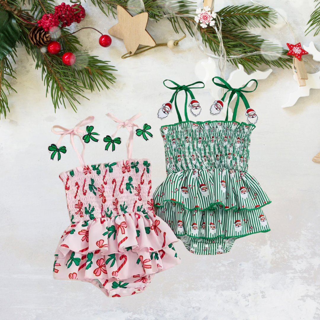 Make this festive season extra sweet with our Christmas Ruffle Rompers! Available in two gorgeous prints — Santa Cutie (green with Santa print) and Candy Cane Dreams (pink with candy cane and bow design). These adorable outfits are made for summer Christmas fun.